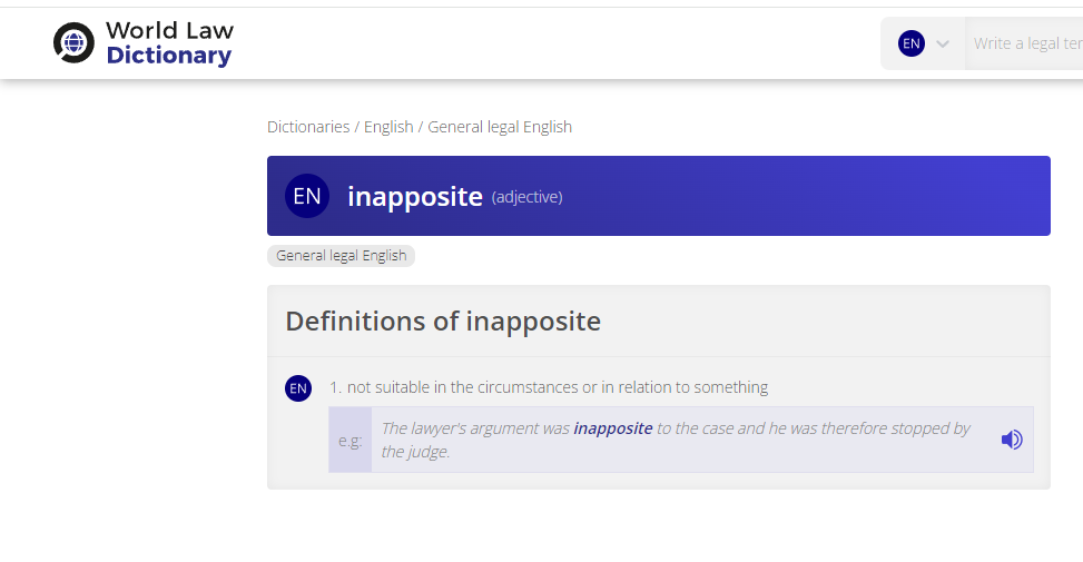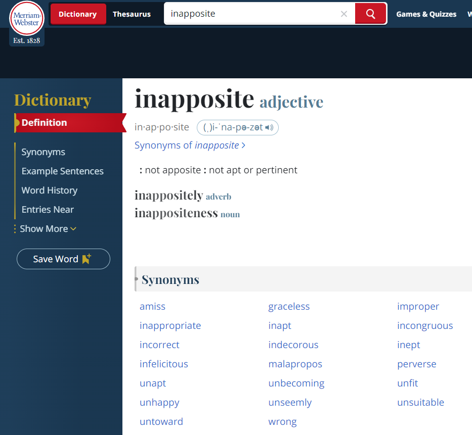 Sometimes words have different meanings in certain circumstances. Let’s see what “inapposite” means in a legal sense. Here’s the entry in something called World Law Dictionary (and if you can’t trust the World Law Dictionary, who can you trust?):
